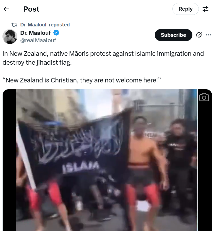 މުޒާހަރާގެ ބައިވެރިންގެ ތެރެއިން ބައެއް މީހުން ނިއުޒީލެންޑްގެ ދިދަތައް ހިފައިގެން ތިބެ ޝުއޫރު ފާޅުކޮށްފައިވާއިރު، ދެން ތިބި މީހުން ވަނީ އިސްލާމްދީން ތަމްސީލުކުރާ ދިދައެއްގެ ކުރިމަތީގައި ތިބެ އެގައުމުގެ ސަގާފީ ހަނގުރާމަވެރި ނެށުމެއް (ހަކާއެއް) ކުރިއަށް ގެންގޮސްފައެވެ.