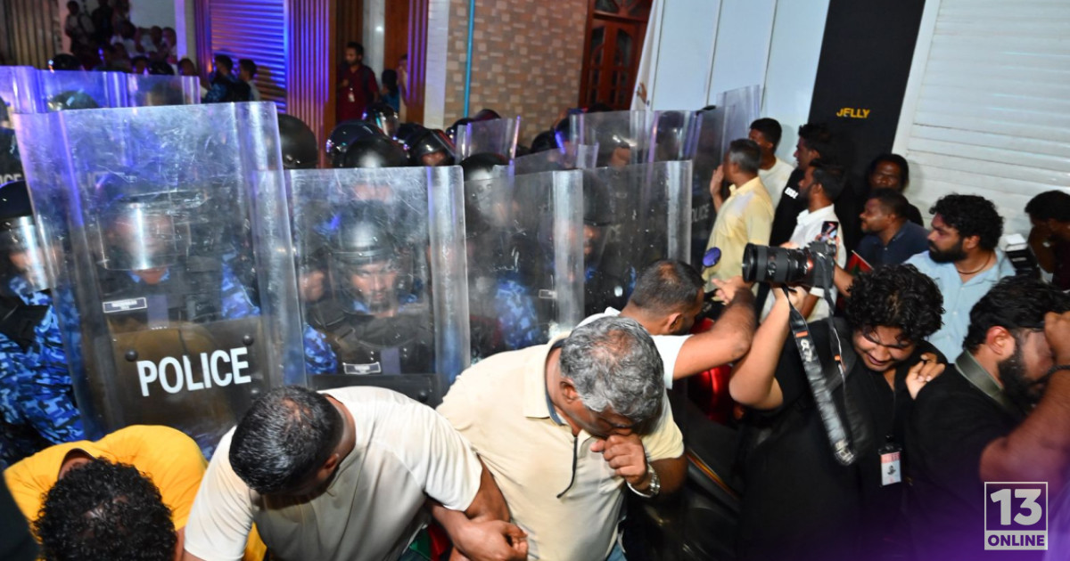 ނަމަވެސް އެކަމަށް އިޖާބަ ނުދީ މުޒާހަރާގެ ބައިވެރިން ފުލުހުންނާ ދިމާލަށް ގަލާއި ފެންފުޅި އުކައި ފުލުހުންގެ އާލާތްތައް އަތުލަން މަސައްކަތްކޮށް ފުލުހުންގެ ވާޖިބު އަދާކުރަން ހުރަސް އަޅާފައިވާ ކަމަށެވެ.