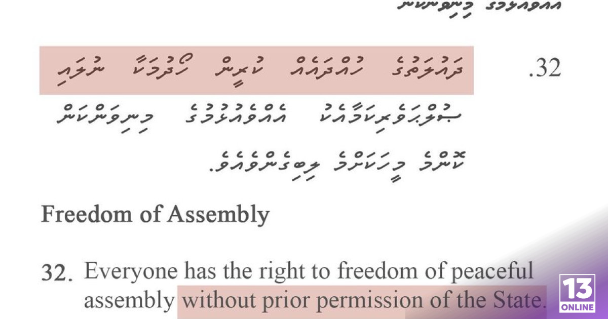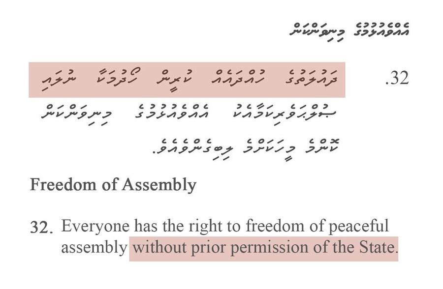މަލީހު މިފަދައިން ވިދާޅުވެފައިވާއިރު، ގާނޫނު އަސާސީގެ 32 ވަނަ މާއްދާގައި ބަޔާންކުރާ ގޮތުގައި ދައުލަތުގެ ހުއްދައެއް ކުރިން ހޯދުމަކާ ނުލާ ސުލްހަވެރިކަމާ އެކު އެއްވެ އުޅުމުގެ މިނިވަންކަން ކޮންމެ މީހަކަށްމެ ލިބިގެންވެއެވެ.