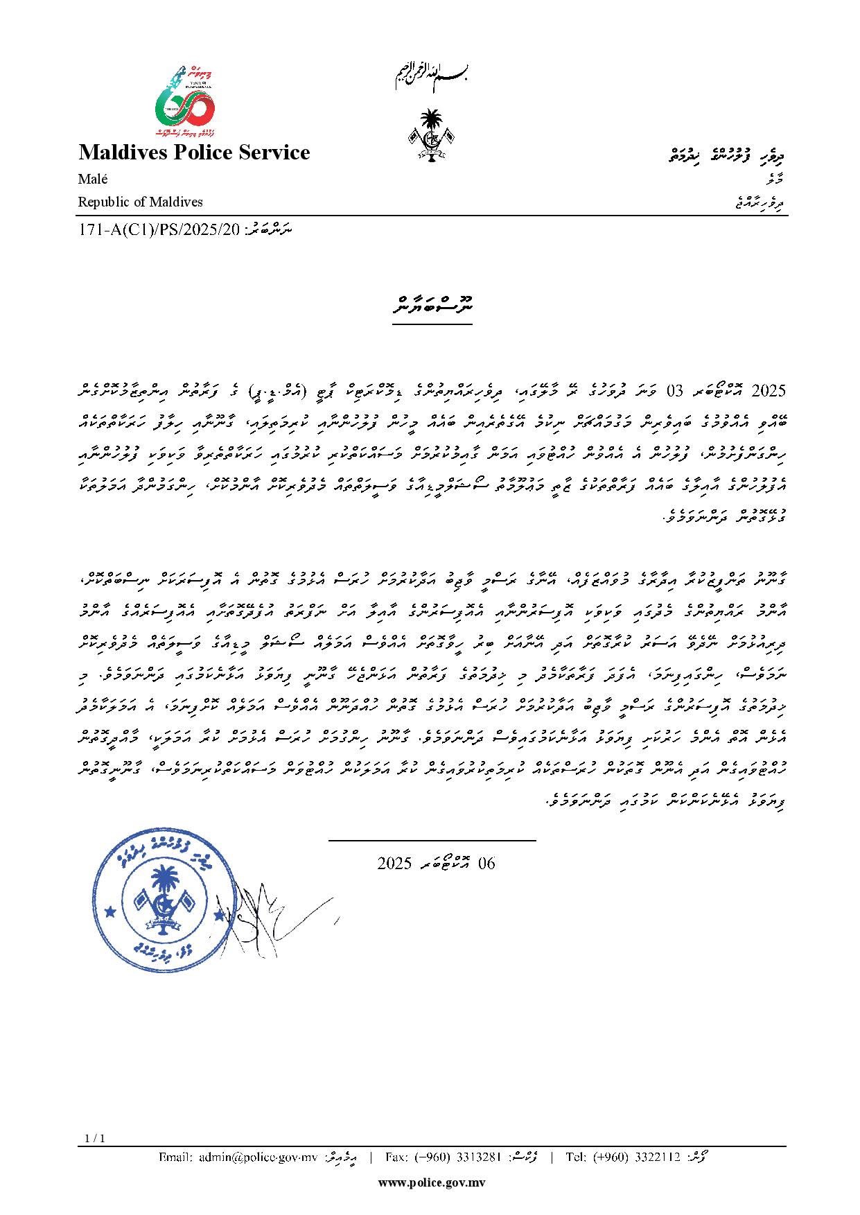 ފުލުހުން މިރޭ އާންމުކުރި ބަޔާނެއްގައި ބުނެފައި ވަނީ މި މަހުގެ ތިން ވަނަ ދުވަހުގެ ރޭ މާލޭގައި، ދިވެހިރައްޔިތުންގެ ޑިމޮކްރަޓިކް ޕާޓީ (އެމް.ޑީ.ޕީ) ގެ ފަރާތުން އިންތިޒާމުކޮށްގެން ބޭއްވި އެއްވުމުގެ ބައިވެރިން މަގުމައްޗަށް ނިކުމެ އޭގެތެރެއިން ބައެއް މީހުން ފުލުހުންނާއި ކުރިމަތިލައި، ގާނޫނާއި ހިލާފު ހަރަކާތްތަކެއް ހިންގަން ފެށުމުން، ފުލުހުން އެ އެއްވުން ހުއްޓުވައި އަމަން ގާއިމުކުރުމަށް މަސައްކަތްކުރި ކުރުމުގައި ހަރަކާތްތެރިވާ ވަކިވަކި ފުލުހުންނާއި އެފުލުހުންގެ އާއިލާގެ ބައެއް ފަރާތްތަކުގެ ޒާތީ މަޢުލޫމާތު ސޯޝަލްމީޑިއާގެ ވަސީލަތްތައް މެދުވެރިކޮށް އާންމުކޮށް، ހިންގަމުންދާ ކަމަށެވެ.