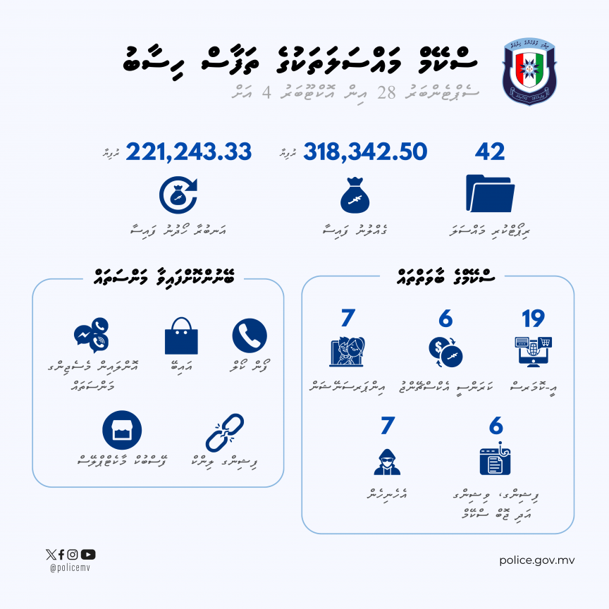 އެގޮތުން، މިދިޔަ މަހު 28އިން މިދިޔަ ހޮނިހިރު ދުވަހުގެ ނިޔަލަށް ސްކޭމްގެ 42 މައްސަލަ ވަނީ ހުށަހަޅާފައެވެ. އެ މައްސަލަތަކުގައި ޖުމުލަ ތިން ލައްކައަށް ވުރެ ގިނަ ރުފިޔާ ގެއްލިގެން ރިޕޯޓުކޮށްފައިވާއިރު، އޭގެ ތެރެއިން 221،242.33 ރުފިޔާ ފުލުހުން ވަނީ ހޯދާފައެވެ.