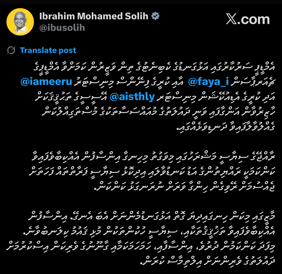 މާޒީގައި މިކަން ހިނގައިދިޔަ ގޮތް އަޅުގަނޑުމެންނަށް އެބަ އެނގޭ ކަމަށާއި އިންސާފުން އެއްކިބާވެފައިވާ ތަޚުޤީޤުތަކާއި، ސިޔާސީ ހުކުންތަކުން މުޅި ޤައުމު ކިލަނބުވާނެ ކަމަށް ސޯލިހްގެ ޕޯސްޓްގައި ބުނެފައިވެއެވެ.