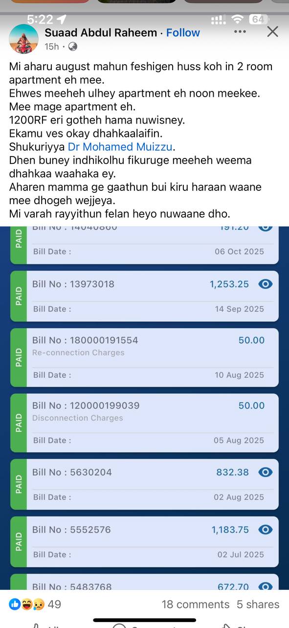 ނަމަވެސް ސެޕްޓެމްބަރު މަހުގެ ބިލުކަމުގައި ބުނެ ހަދާފައި އިން ކަރަންޓު ބިލަށް 1200 ރ އަށް ވުރެ މައްޗަށް ފައިސާ އަރަން ޖެހުނު ސަބަބެއް ނުވިސްނޭ ކަމަށާ ނަމަވެސް އޭނާ މިހާރު ބިލު ދައްކާފައިވާ ކަމަށް ވެސް ޕޯސްޓުގައި ބުނެފައިވެއެެވެ. އޭނާ ވަނީ ކަރަންޓު ބިލުގެ ތަފްސީލު ފެންނަ ފޮޓޯއެއްވެސް ހިއްސާކޮށްފައެވެ.