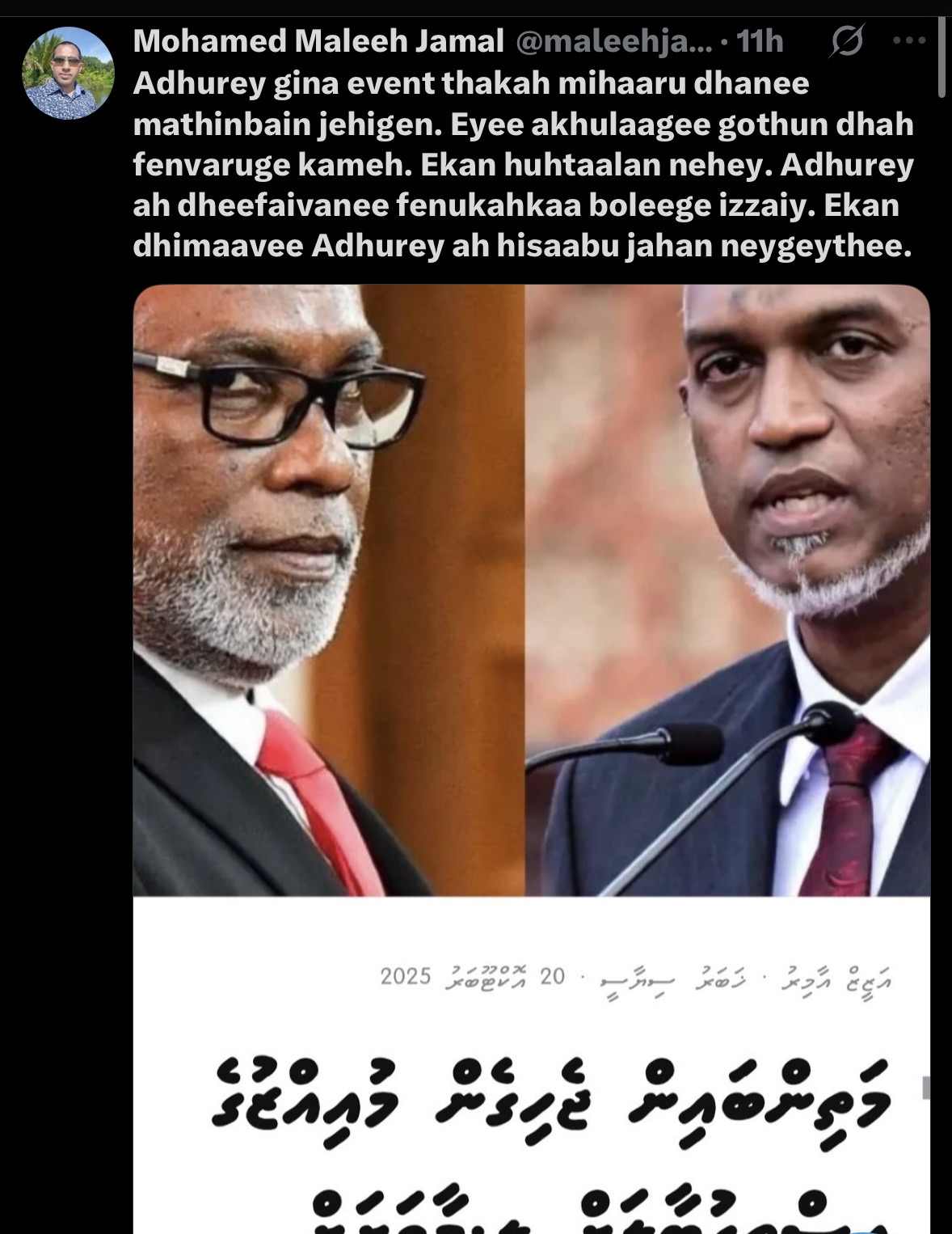 އަދުރޭ އަމިއްލައަށް މަތިންބައިން ޖެހިގެން ރައީސް މުއިއްޒުގެ އިވެންޓްތަކަށް ދިޔުމަކީ އަޚްލާގީ ގޮތުން ދަށް ފެންވަރުގެ ކަމެއް ކަމަށާއި އެކަން ހުއްޓާލަން ޖެހޭ ކަމަށް މަލީހްގެ ޕޯސްޓްގައި ބުނެފައިވެއެވެ.