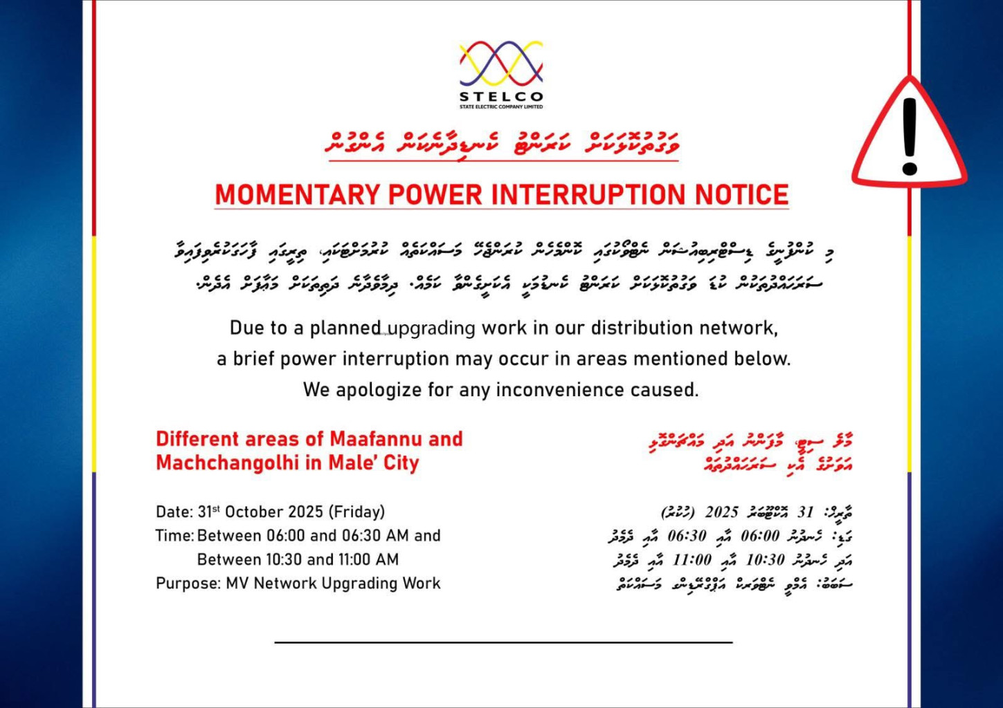 މިގޮތުން މިއަދު ހެނދުނު މާފަންނު އަދި މައްޗަންގޯޅީގެ ސަރަހައްދުތަކުން ހެނދުނު 06:00 އިން 06:30 އަށް ކަރަންޓް ކަނޑާލައިފައިވެއެވެ. އަދި 10:30 އިން 11:00 އަށް އެމްވީ ނެޓްވޯކް އަޕްގްރޭޑް މަސައްކަތުގެ ނަމުގައި ވަނީ ކަރަންޓް ކަނޑާލާފައެވެ.