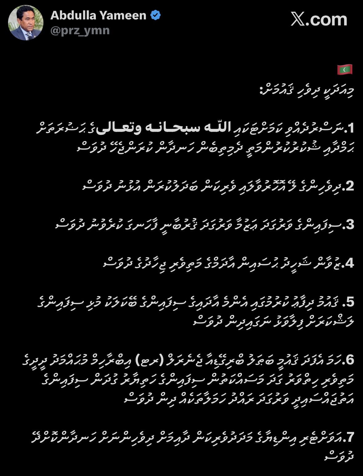 ނަސްރުގެ ދުވަހާއި ގުޅިގެން އެމަނިކުފާނުގެ އެކްސްގައި ކުރެއްވި ޕޯސްޓެއްގައި ވިދާޅުވީ އެ ބިރުވެރި ދުވަހުގައި މި ގައުމަށް ނަސްރު ދެއްވި ކަމަށްޓަކައި اللّه سبحانه وتعالى ގެ ހަޟުރަތަށް ހަމްދާއި ޝުކުރު ދަންނަވާ ކަމަށާއި ޝުކުރު ކުރުން މަތީ ދިވެހިން އަބަދުވެސް ތިބެންޖެހޭނެ ކަން މިއަދުގެ ހާދިސާއިން ހަނދާންކުރަން ޖެހޭނެ ކަމަށެވެ.