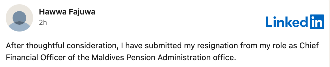 އޭނާ ލިންކްޑްއިން ޕޯސްޓެއްގައި އެކަން ހާމަކުރެއްވި ނަމަވެސް، އިސްތިއުފާދެއްވި ސަބަބެއް ވިދާޅެއްނުވެ އެވެ.