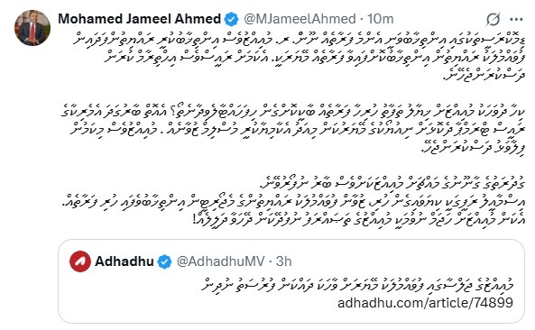 މިގޮތުން ޑރ ޖަމީލް އެކްސްގައި ކުރެއްވި ޕޯސްޓެއްގައި ވަނީ މުއިއްޒާއި ޚިޔާލު ތަފާތުވާ ފަރާތްތައް ބާކީކޮށްގެން ކިހާ ދުވަހެއް ވަންދެން ހިފަހައްޓާލެވޭނެތޯ އައްސަވާފައެވެ.