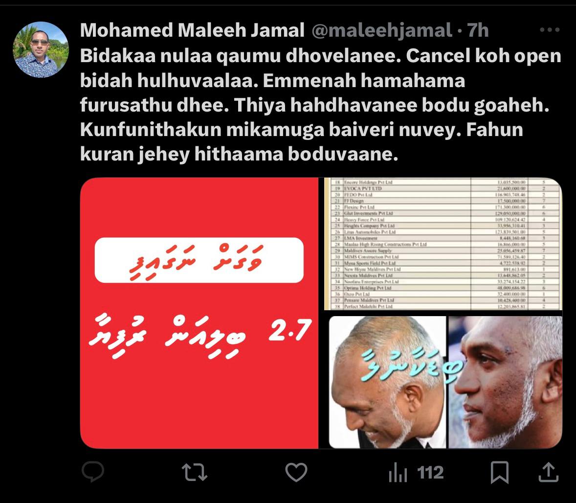މިގޮތުން މަލީހް އެކްސްގައި ކުރެއްވި ޕޯސްޓެއްގައި ބުނެފައިވަނީ 2.7 ބިލިއަނުގެ މި ވައްކަން ވަގުތުން ހުއްޓާލައި ދެފުށް ފެންނަ ބިޑަކަށް ހުޅުވާލުމަށް ގޮވާލާ ކަމަށެވެ.