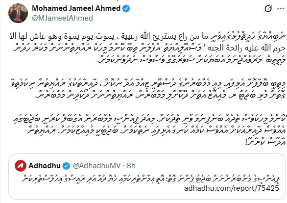 މަސްއޫލިއްޔަތު އުފުލަން ތިބޭ ކޮންމެ މީހަކު ރައްޔިތުންނަށް މަކަރު ހެދުން މަތީތިބެ މަރުވެއްޖެނަމަ އެބަޔަކަށް ސުވަރުގޭގެ ވަސްވެސް ނުދުވާނެކަމަށް ރަސޫލާﷺ ގެ ސުންނަތުން ސާބިތުވާ ކަމަށް ވިދާޅުވެ ޕީއެންއެފްގެ ނައިބު ރައީސް ޑރ މުހައްމަދު ޖަމީލް އަހްމަދު ޕީއެންސީގެ މަޖިލިސް މެންބަރުންނަށް ފާޑުކިޔުން އަމާޒުކޮށްފިއެވެ.