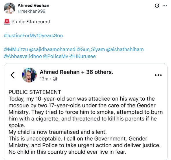 މޯލްޑިވްސް ޑިވަލޮޕްމަންޓް އޭލިއަންސް (އެމްޑީއޭ) ޔޫތް ކައުންސިލްގެ ޗެއަރ އަހްމަދު ރީހާން އެކްސްގައި ކޮށްފައިވާ ޕޯސްޓެއްގައި ބުނެފައިވަނީ ރީހާންގެ 10 އަހަރުގެ ދަރިފުޅު ނަމާދަށް މިސްކިތަށް ދިޔަ މަގުމަތީގައި ޖެންޑާގެ ބެލުމުގެ ދަށުގައި ތިބި ކުދިން އެ ކުއްޖާއަށް ބިރުދައްކައި އަނިޔާކޮށްފައިވާ ކަމަށެވެ.