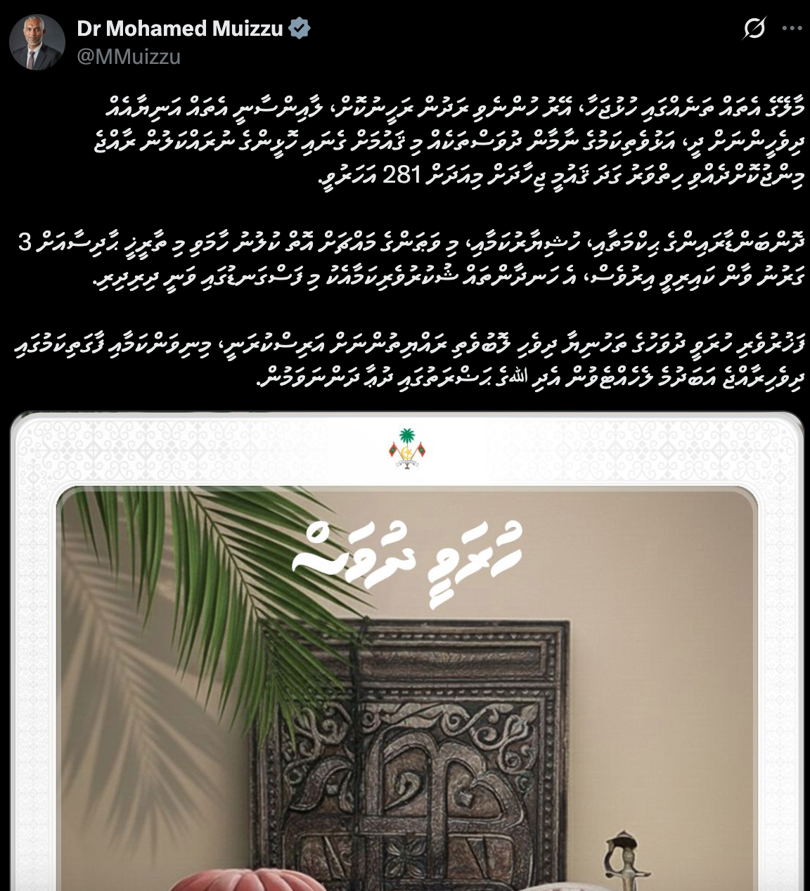 މީގެއިތުރުން ރައީސް އޮފީހުން ނެރުނު ޚަބަރުގައި ވެސް ރައީސް މުއިއްޒުގެ އެކްސް އެކައުންޓުން ކުރެއްވި ޕޯސްޓުގެ ވާހަކަ ފާހަގަކޮށް ބުނެފައިވަނީ "މިއަދަކީ ހުރަވީ" ދުވަސްކަަމަށެވެ.