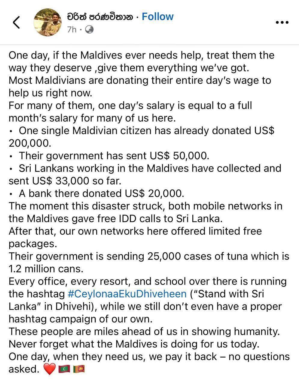 މި ހާލަތުގައި ދިވެހިން ދައްކުވައިދިން އިންސާނިއްޔަތުކަމުގެ މިސާލު ލަންކާގެ ރައްޔިތުންގެ ހިތްތަކުން ފޮހެވިގެން ނުދާނެކަމަށް ލަންކާގެ ގިނަ ފަރާތްތަކުން ބުނަމުންދެއެވެ. ފޭސްބުކްގައި ލަންކާ މީހަކު ކޮށްފައިވާ ޕޯސްޓެއްގައި ބުނެފައިވަނީ "އަހަރެމެންނަށް ދިވެހިން ދައްކުވައިދިނީ އިންސާނިއްޔަތުކަމުގެ އެންމެ ފުރިހަމަ މިސާލު. އެމީހުންގެ ކުޑަކަމަށް ބަލައިގެން ނުވާނެ. އެމީހުންގެ ހިތްތައް ވަރަށް ބޮޑު." މިފަދައިންނެވެ.