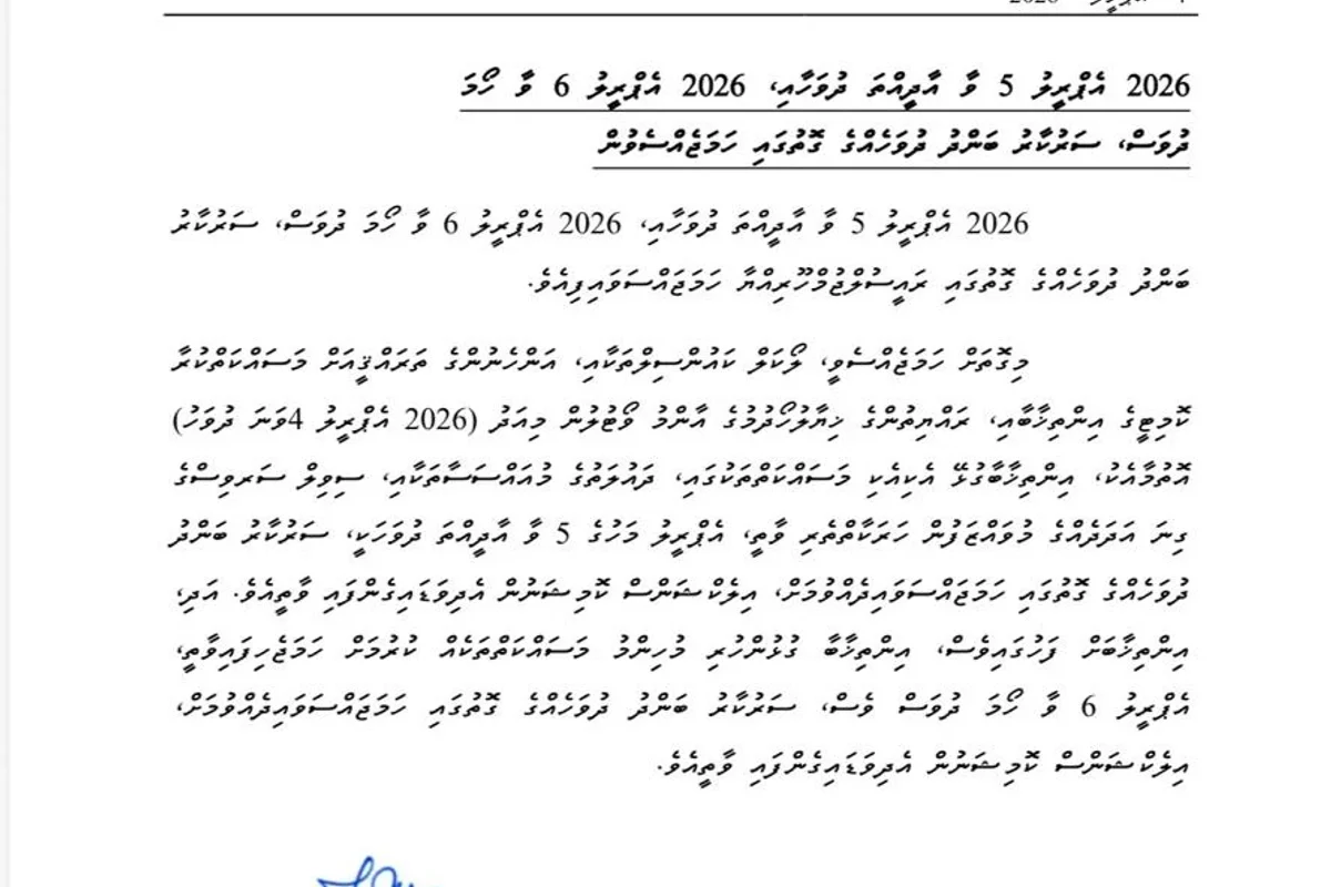 ރައީސުލްޖުމްހޫރިއްޔާގެ އޮފީހުގެ ފަރާތުން ޗީޕުއޮފް ސްޓާފު އަހުމަދު ފަޔާޒު ސޮއިކުރައްވާ ނެރެފައިވާ ދެންެނެވުމެއްގައި ހާމަކޮށްފައިވާ ގޮތުގައި، ލޯކަލް ކައުންސިލް އިންތިހާބާ އަނެހްނުންގެ ތަރައްގީއަށް މަސައކްަތްކުރާ ކޮމިޓީގެ އިންތިހާބާ ރައްޔިތުންގެ ޚިޔާލު ހޯދުމުގެ އިންތިޚާބުގެ އާންމު ވޯޓުލުން 04 އެޕްރިލް 2026 ވީ ހޮނިހިރު ދުވަހު އޮތުމާއެކު އެ އިންތިޚާބުގެ އެކި އެކި ކަންކަމުގައި ސަރުކާރުގެ އެކި މުއައްސަސާތަކާ ސިވިލް ސާވިސްގެ ވެސް ގިނަ މުވައްޒަފުން ހަރަކާތްތެރިވަމުން ގެންދާތީ 05 އެޕްރިލްވާ އާދިއްތަ ދުވަހެއްގެ ގޮތުގައި ކަނޑައަޅައިދިނުމަށް އިލެކްޝަން ކޮމިޝަނުން އެދިފައިވާ ކަމަށެވެ.