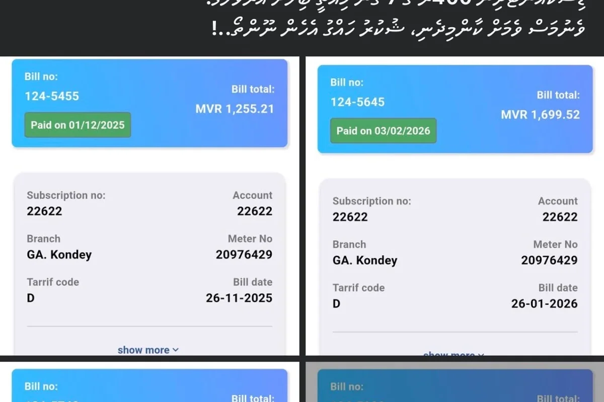 ނިމިދިޔަ ރަމަޟާން މަހު ސަރުކާރުން ދިން ޚާއްޞަ ޑިސްކައުންޓަށް ފަހު، ފެނަކަ ކޯޕަރޭޝަނުން އަތޮޅުތެރޭގެ ރަށްތަކަށް ފޮނުވި ކަރަންޓު ބިލުތައް އާދަޔާ ޚިލާފަށް ބޮޑުވެފައިވާތީ އާންމުންގެ ބޮޑެތި ކަންބޮޑުވުންތަކެއް ފެންމަތިވެއްޖެއެވެ. ސޯޝަލް މީޑިއާގައި ގިނަ ބަޔަކު ދަނީ ބިލުތަކުގެ ސްކްރީންޝޮޓްތައް ހިއްސާކޮށް، ސަރުކާރަށް ވަރަށް ބޮޑަށް ފާޑުކިޔަމުންނެވެ.