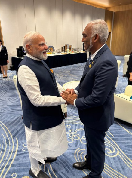 Interacted with President Muizzu of Maldives on the sidelines of the SCO Summit in Tianjin. India’s developmental cooperation with Maldives is greatly beneficial for our people.@MMuizzu pic.twitter.com/DyQJH77Snc
